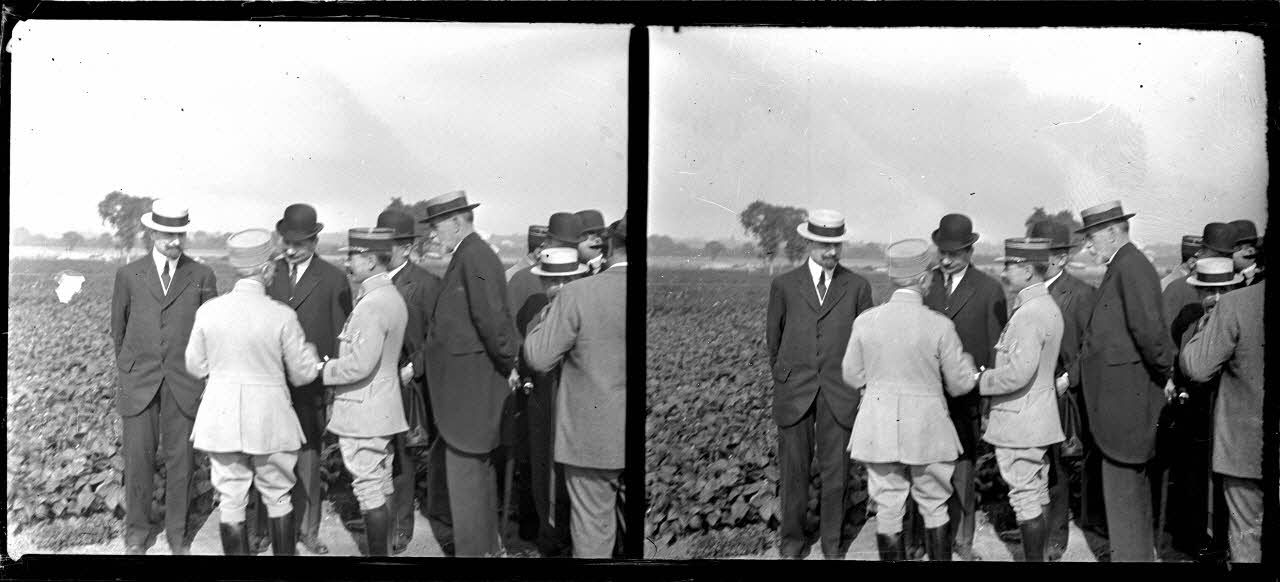 Le Tremblay (Seine et Oise). M. David, ministre de l'agriculture. Le capitaine Morin, directeur de culture des troupes disponibles visitent le champ de culture. [légende d'origine]