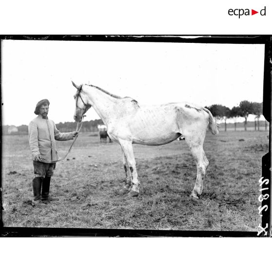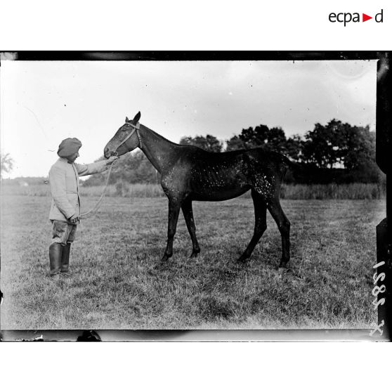 Un vétérinaire examinant un cheval au chenil militaire de Satory.