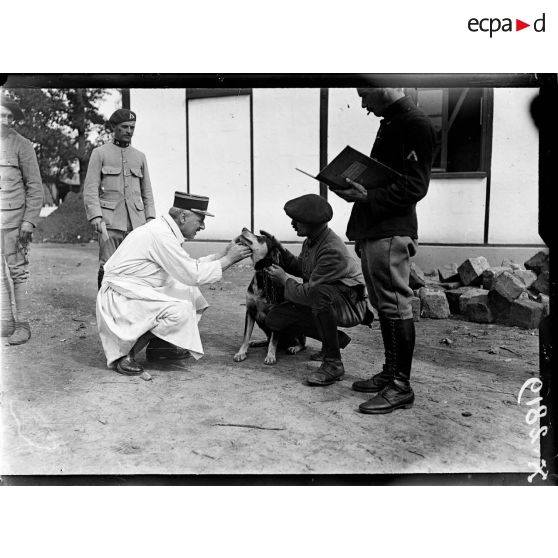 Un vétérinaire examinant un chien au chenil militaire de Satory.