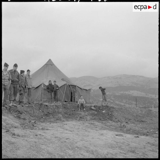 Une tente est dressée par les soldats de l'infanterie de marine cantonnée à Bou-Medfa, à la suite du séisme.