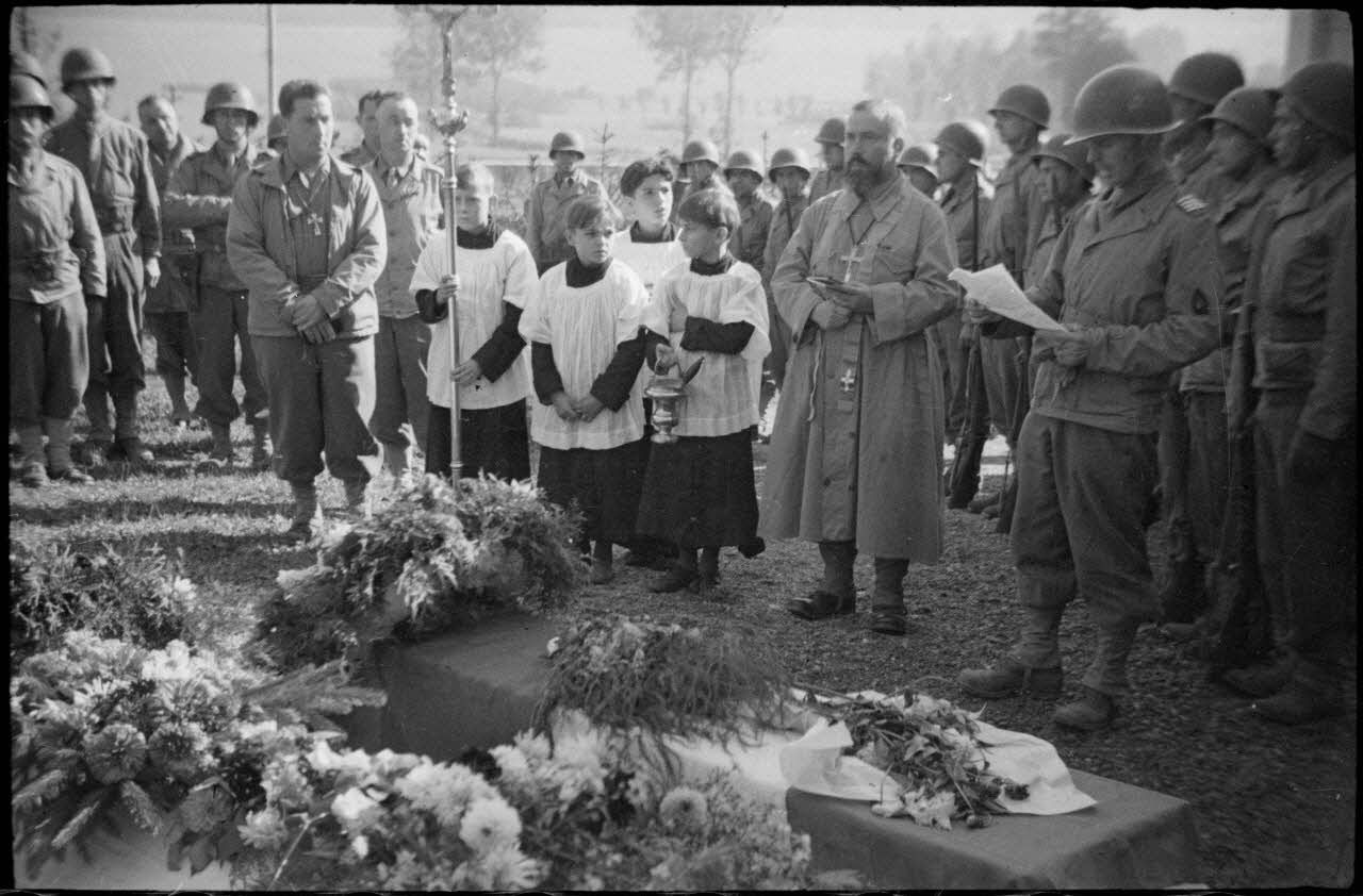 Lors des obsèques de deux officiers français de la 1re Armée française morts au champ d'honneur, un dernier hommage est rendu aux victimes par l'aumônier, un commandant et les hommes de l'unité, vraisemblablement un escadron de chasseurs d'Afrique. L'un des défunts serait le colonel Desazars de Montgailhard, chef de corps du 5e régiment de chasseurs d'Afrique (5e RCA) en 1943-1944 (1). Les familles endeuillées assistent également aux funérailles.