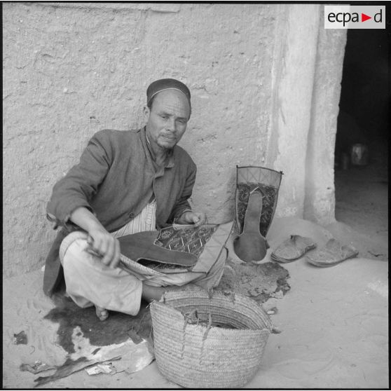 Cordonier algérien travaillant dans la rue d'une mechta de Ghadamès.