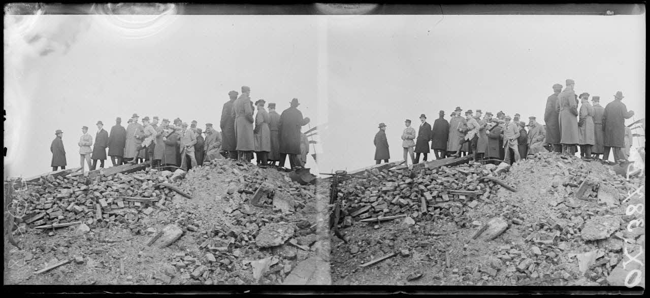Lens (Pas-de-Calais), mission de journalistes étrangers. La mission examine les ruines d’un pont. [légende d'origine]
