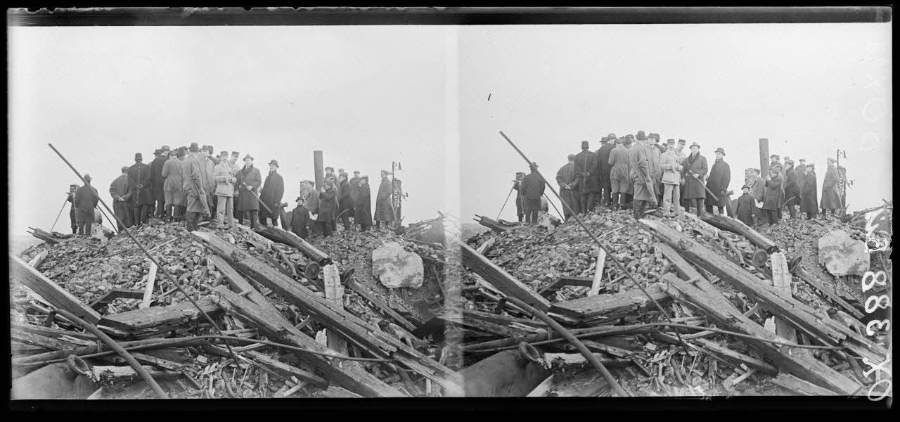 Lens (Pas-de-Calais), mission de journalistes étrangers. La mission sur les ruines d’un pont. [légende d'origine]