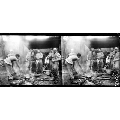 Forêt d'Orléans. Les Bordes. Campement de prisonniers. Toilette autour du feu.