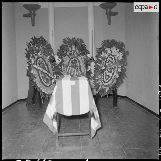 Le cercueil du reporter Robert Capa dans la chapelle ardente.