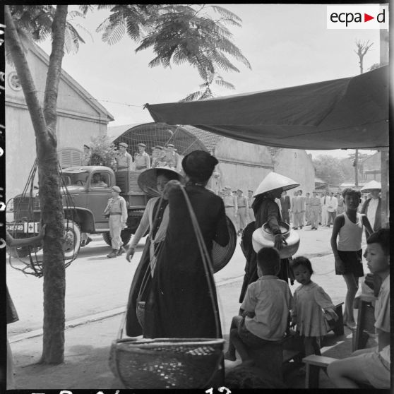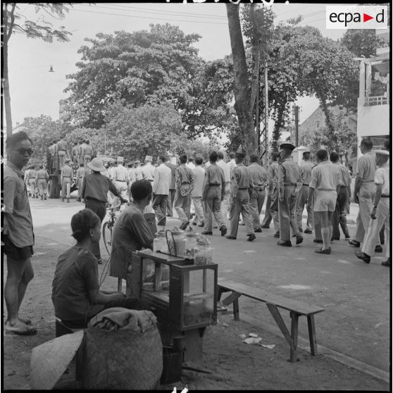 Le convoi funéraire des obsèques du reporter Robert Capa dans une rue d'Hanoï.