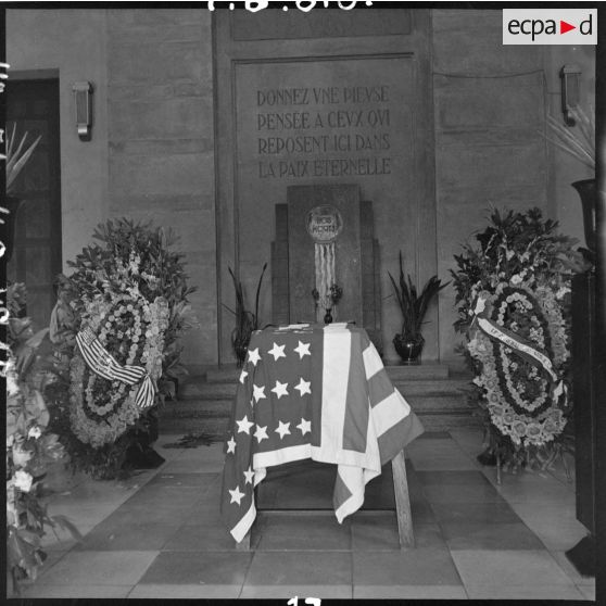 Les autorités civiles et militaires autour du cercueil du reporter Robert Capa.