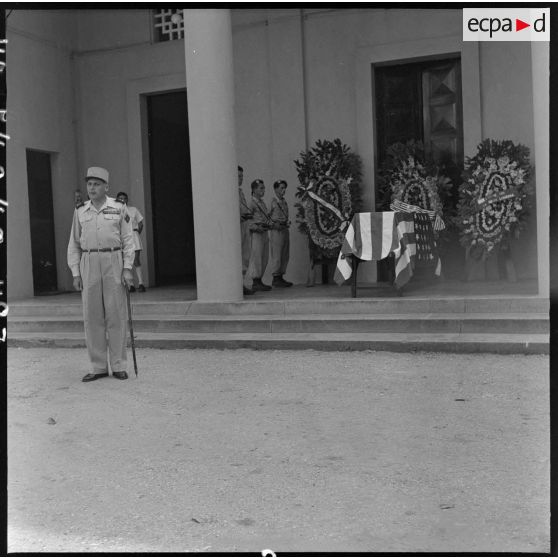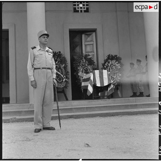 Le général Cogny, commandant en chef des FTNV (forces terrestres du Nord-Vietnam), lors des obsèques du reporter Robert Capa.