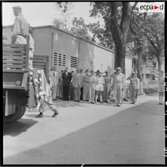 Les autorités civiles et militaires saluent au passage du véhicule transportant le cercueil du reporter Robert Capa.