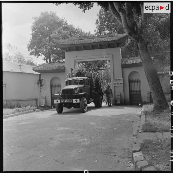 Le véhicule militaire transportant le cercueil du reporter Robert Capa sort de l'hôpital.
