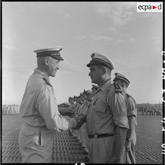 Avant son départ d'Hanoï, le général Dechaux, commandant du GATAC-Nord pendant la bataille de Diên Biên Phu, est décoré commandeur de la Légion d'honneur par le général Jouhaud.