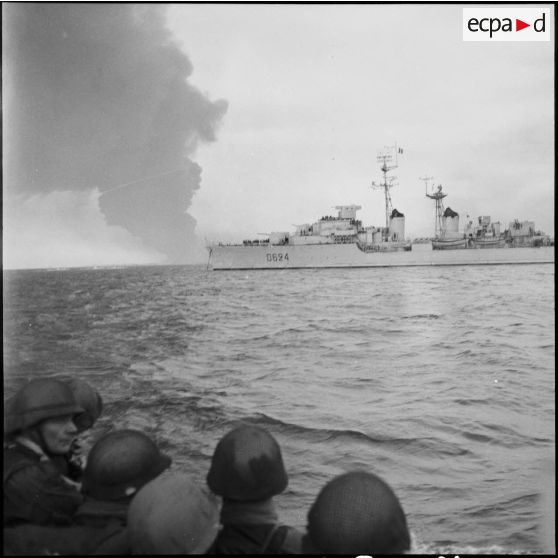 Le LCVP 43 passe à proximité de l'escorteur d'escadre Bouvet, lors de l'opération amphibie à Port-Fouad.