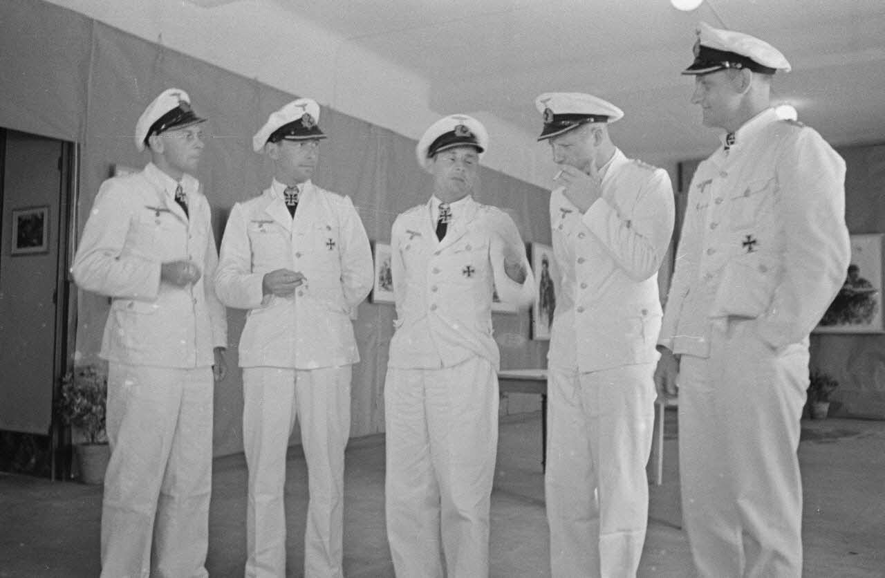 Les commandants de sous-marins Engelbert Endrass, Claus Korth, Heinrich Lehmann-Willenbrock, Erich Topp et Herbert Kuppisch visitent une exposition de dessins et de peintures à hôtel Royal de La Baule.