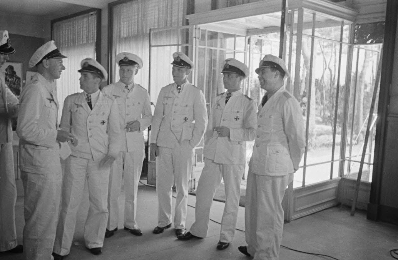 Les commandants de sous-marins Engelbert Endrass, Claus Korth, Heinrich Lehmann-Willenbrock, Erich Topp et Herbert Kuppisch visitent une exposition de dessins et de peintures à hôtel Royal de La Baule.