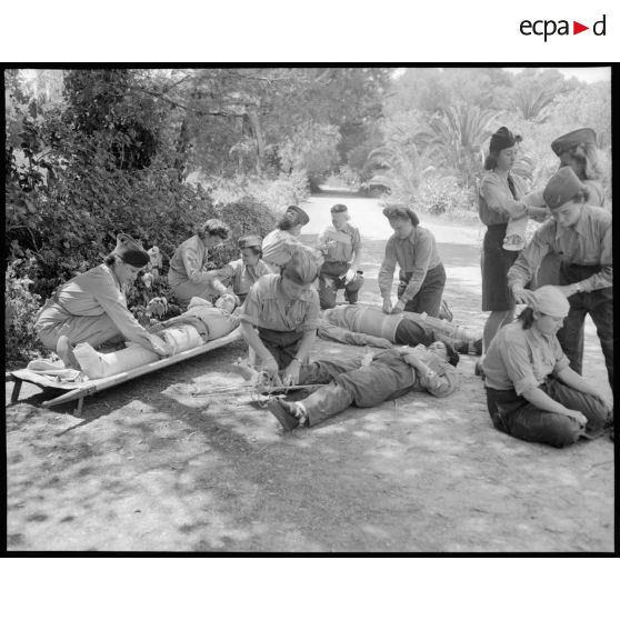 Cours de soins aux blessés avec utilisation de civières à l'école de La Vigie en Algérie.
