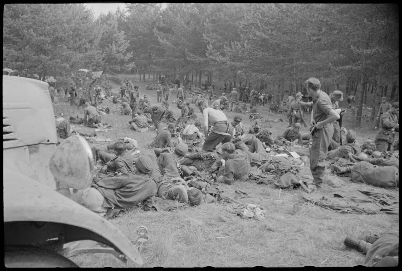 Après avoir défendu la ville de Vilnius, des fantassins allemands se ravitaillent.