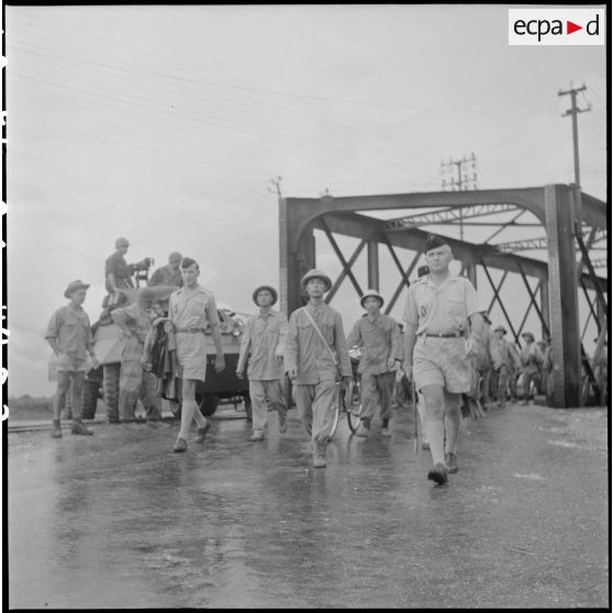 Des soldats de l'APVN (Armée populaire vietnamienne) et deux officiers du CEFEO (Corps expéditionnaire français en Extrême-Orient) devant le pont Paul-Doumer (aujourd'hui Long Biên).