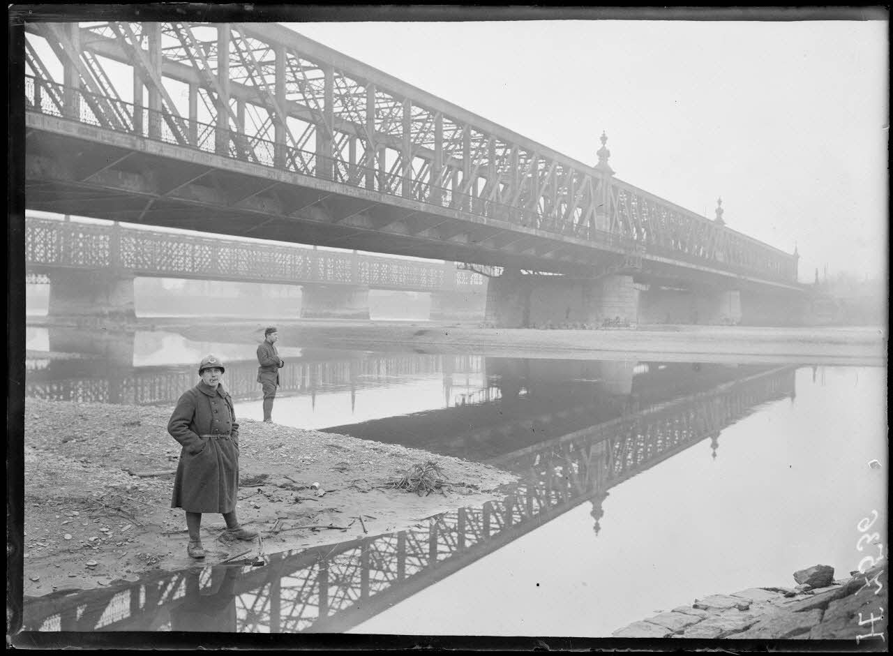 A Strasbourg, au début du mois de décembre 1918, des soldats alsaciens libérés du service militaire allemand passent sur le pont Kehl, gardé à chaque extrémité par des sentinelles (d'un côté sentinelles allemandes, de l'autre sentinelles françaises). Les évacués en provenance d'Allemagne sont triés. Sur ce pont, des officiers français réceptionnent des camions allemands (camions Dameler avec roues ferrées à amortisseurs remplaçant les pneumatiques).