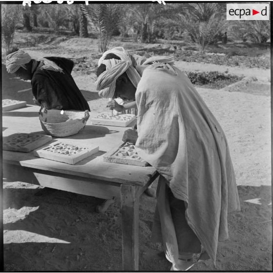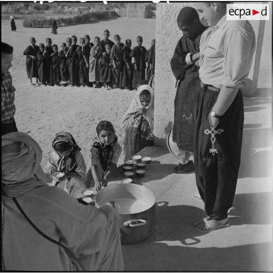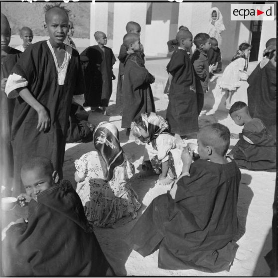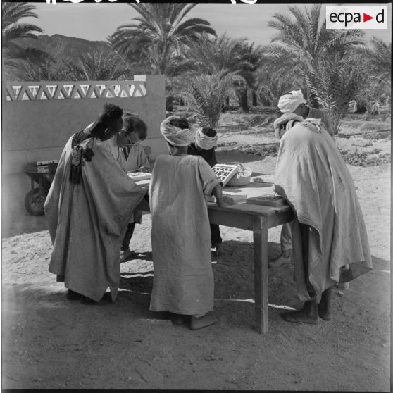 Grâce à l'irrigation traditionnelle (puits) et moderne (pompe à eau), ces villages ont pu développer des activités agricoles. Djanet possède aussi son école dans laquelle les enfants apprennent le français auprès de l'instituteur, nommé monsieur Bobo. L'enseignement est mixte. Des cours artisanaux (travail du bois) et techniques (arrosage du jardin de l'école grâce à une pompe) sont aussi dispensés aux élèves. Le village dispose d'un dispensaire où officie un médecin-lieutenant, appartenant à l'Aide médicale gratuite (AMG). Les enfants sont traités contre les infections oculaires ou contre la variole. Ainsi, après "l'épreuve de la vaccination", ils reviennent à l'école pour boire un bol de lait et l'opérateur de prise de vue Gérard Py leur apprend à se servir de sa caméra. L'AMG distribue également du blé aux Touaregs. Dans la cour ombragée de l'école, les élèves se rassemblent par petits groupes et boivent le traditionnel thé à la menthe car c'est la fin de l'année. [1]. Pendant ce temps, dans la palmeraie de Djanet, les Touaregs cueillent les dattes, les pamplemousses et s'occupent des travaux d'irrigation. Les femmes et les enfants offrent leur visage au photographe.