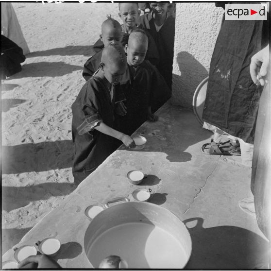 Les enfants vaccinés boivent le lait qui leur a été distribué.