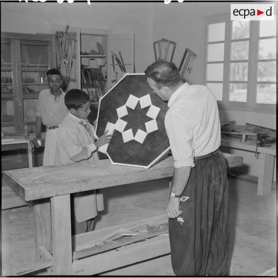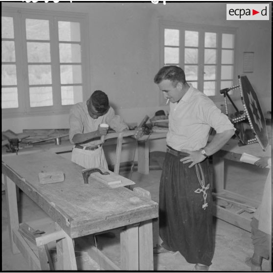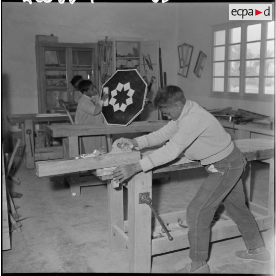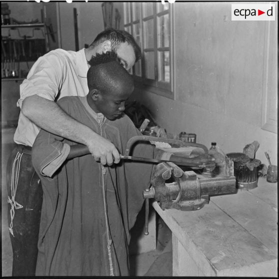 Le maître d’école apprend à un élève le maniement de la scie à métaux.