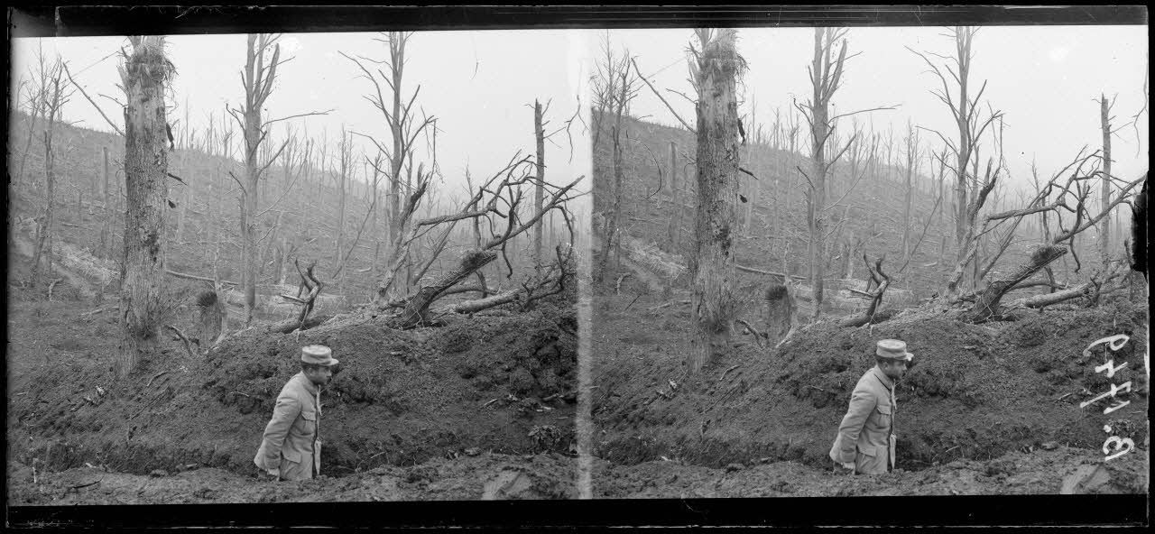 Les Eparges (Meuse). Extrémité droite de la crête des tranchées des Eparges prises du Piton ; au fond le village et le ravin Sans Nom ; en haut, tranchée de Calonne. Le Piton a été pris le 17.2, perdu le 18 et repris le 19.2.1915.