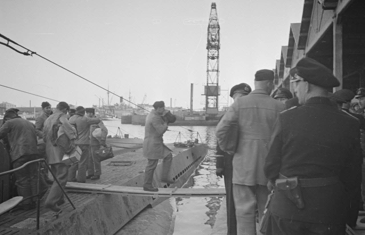 Les équipages des sous-marins allemands U-46 et U-97 débarquent sur le quai du port de Saint-Nazaire.