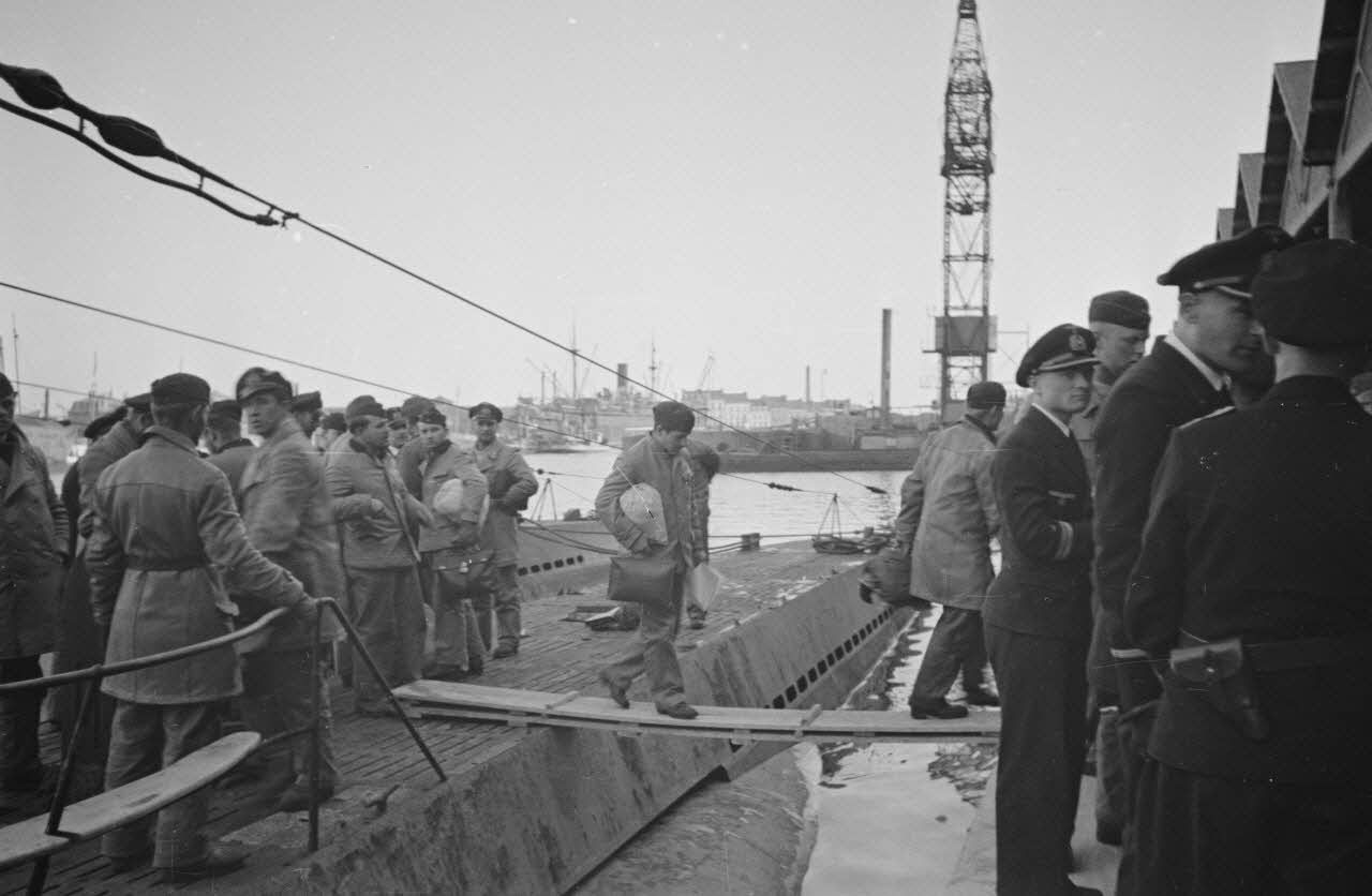 Les équipages des sous-marins allemands U-46 et U-97 débarquent sur le quai du port de Saint-Nazaire.
