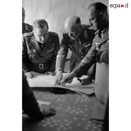 Les généraux Cavarello, Bastico, Crüwell et Gause, entourés d'autres officiers italiens et allemands, étudient une carte posée sur une table.