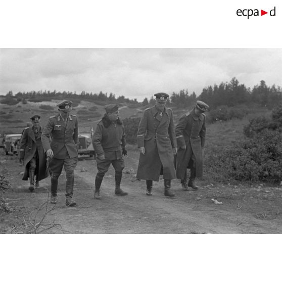 Le long d'un sentier, les généraux Cavarello, Crüwell et Gause, en compagnie d'officiers d'état-major.