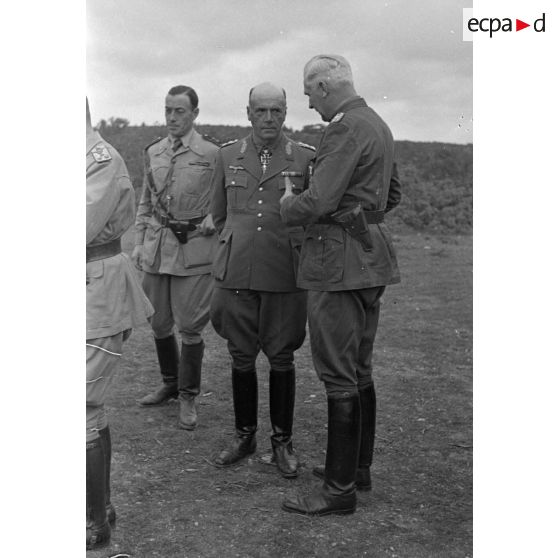 Le général (Generalmajor) Alfred Gause serre la main d'un officier d'état-major allemand, au centre de la photo, le général italien Ettore Bastico.