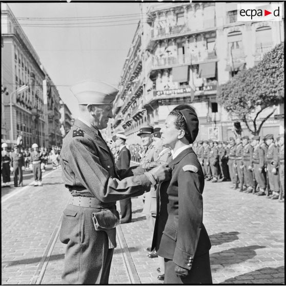 A l'issue du défilé, et avant de se rendre au monument aux morts, le général d'armée Raoul Salan, remet à Robert Lacoste, la croix de la valeur militaire avec palme.