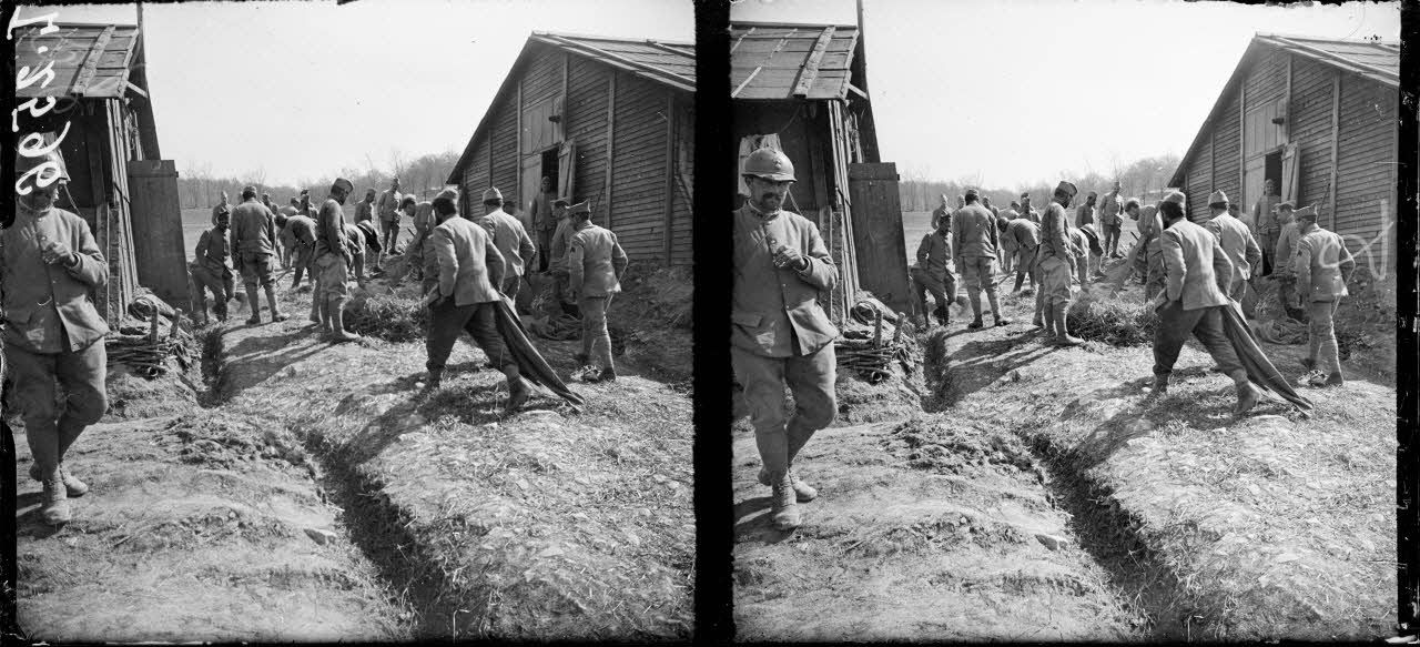 - au Four-de-Paris, des soldats dans une tranchée, en contre-bas la forêt détruite (SPA 55 L 2591), devant le PC (poste de commandement) du commandant Vielzeux, un fusil Lebel modèle 1886 modifié 1893 monté sur un socle en bois afin de l'utiliser comme lance-grenade (seul fusil apte à supporter le choc de départ), sans son accessoire (le Tromblon VB, Viven-Bessières, SPA 55 L 2592), le commandant Vielzeux et ses officiers près de la 3e tranchée (SPA 55 L 2593), une ferme et les fortifications adjacentes faites de gabions, SPA 55 L 2598 ;