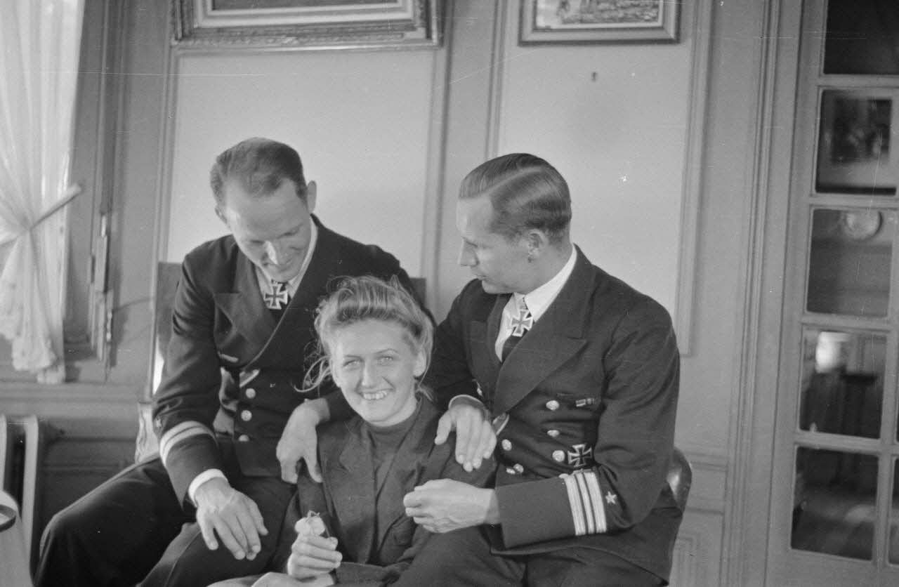 Depuis le port de Saint-Nazaire, le départ en mer des sous-marins U-93 et U-94 et les portraits des lieutenants (Oberleutnant zur See) Topp et Endrass en compagnie d'une femme.