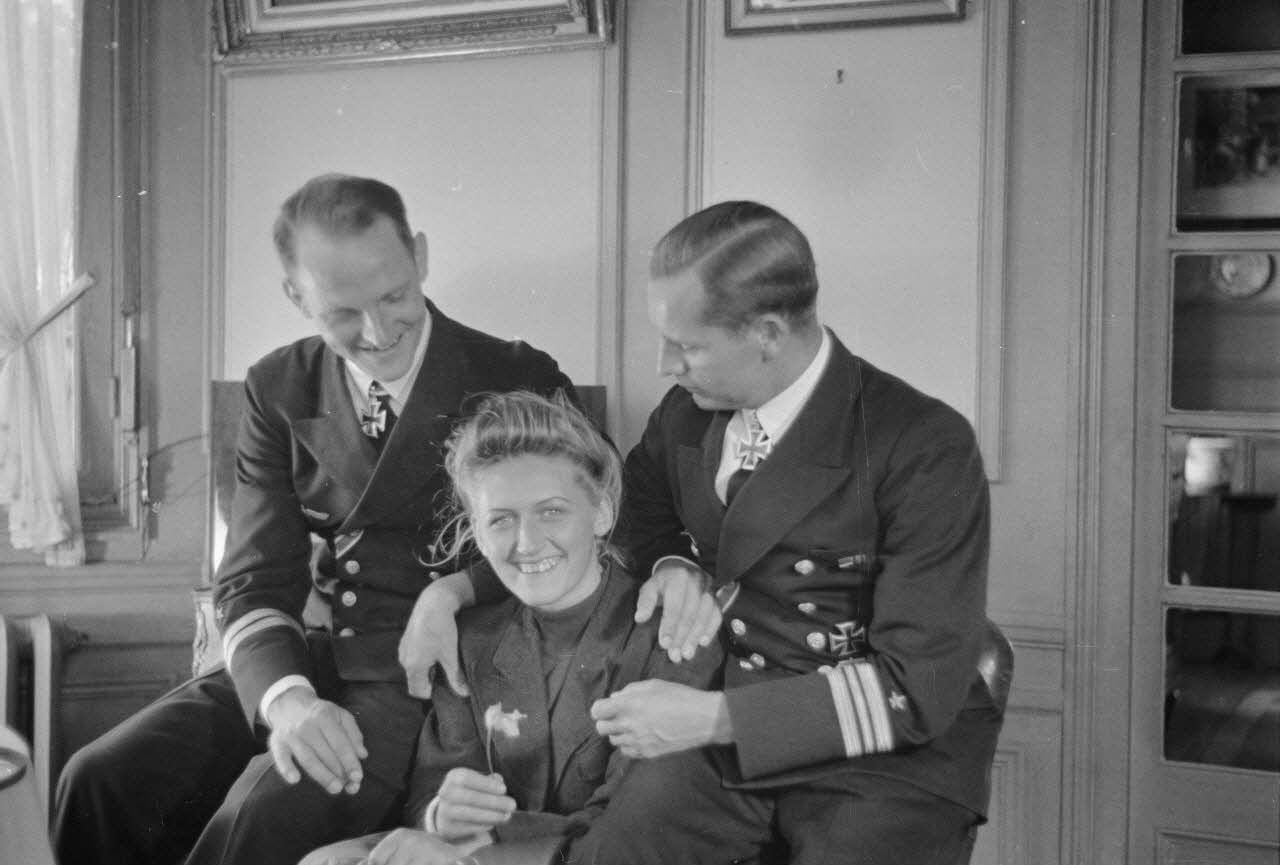 Les lieutenants (Oberleutnant zur See) Erich Topp, commandant du sous-marin U-552 et Engelbert Endrass, commandant du sous-marin U-46, en compagnie d'une jeune femme.