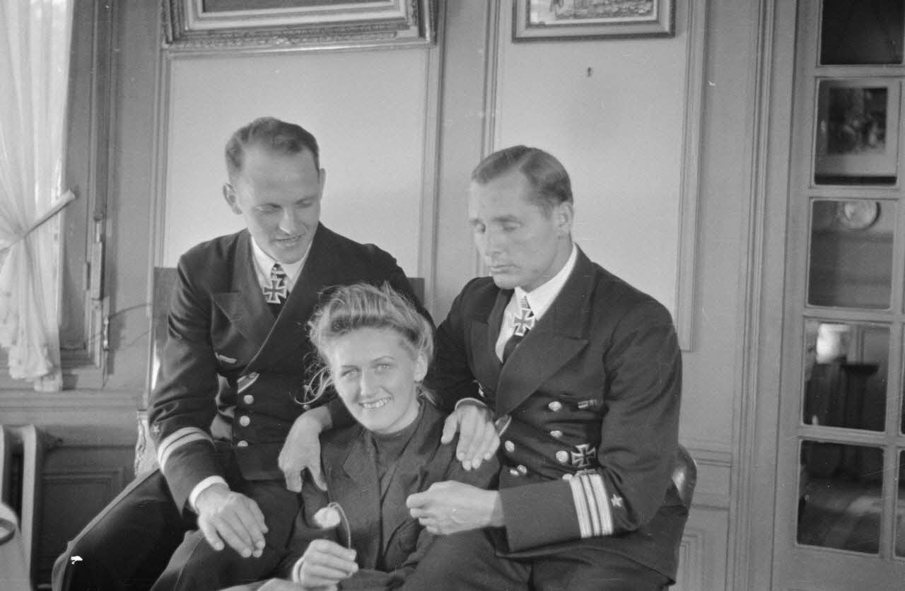Les lieutenants (Oberleutnant zur See) Erich Topp, commandant du sous-marin U-552 et Engelbert Endrass, commandant du sous-marin U-46, en compagnie d'une jeune femme.