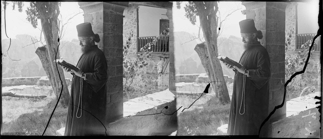 Les Météores (Thessalie). Couvent de Saint Varlaam. Moine lisant. [légende d'origine]