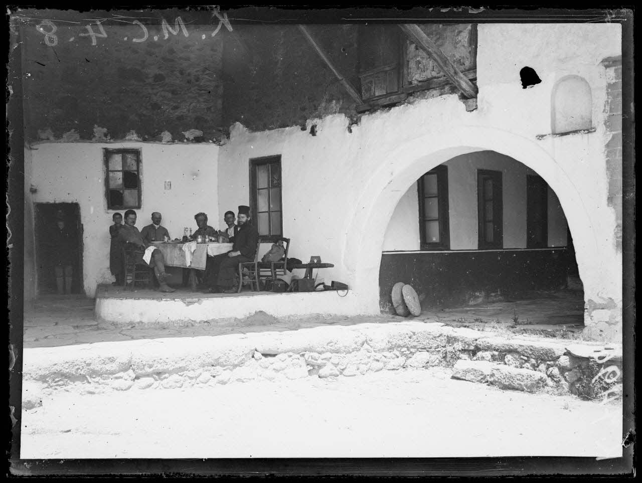 Les Météores (Thessalie). La section photographique de l'armée déjeunant au couvent du Grand Météore.