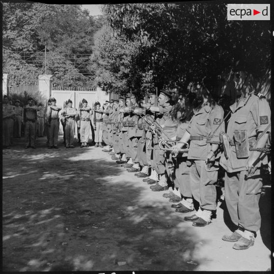 Le capitaine de vaisseau Ponchardier et ses troupes de fusiliers-marins lors des obsèques de l'enseigne de vaisseau Le Troadec.