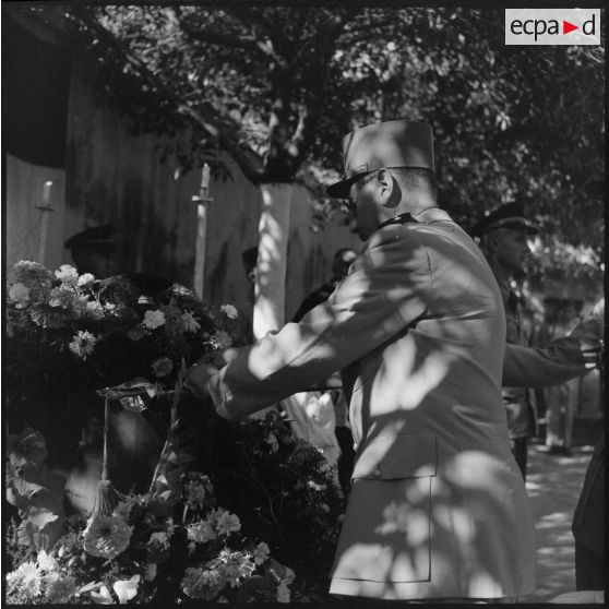 Un général de division déposant un sabre sur le cercueil de l'enseigne de vaisseau Le Troadec.