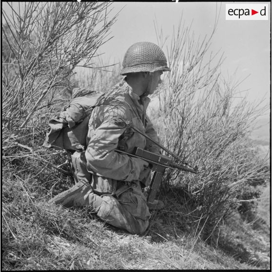 Un parachutiste tire sur un rebelle caché dans les ronces.
