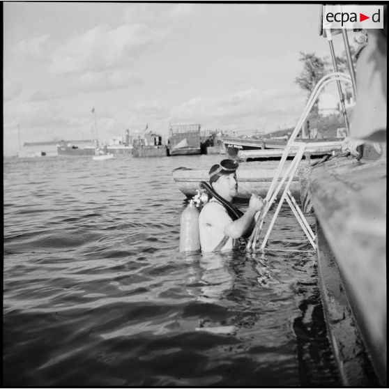 Un plongeur de la Marine nationale récupère les armes jetées dans le canal de Suez par les Egyptiens.