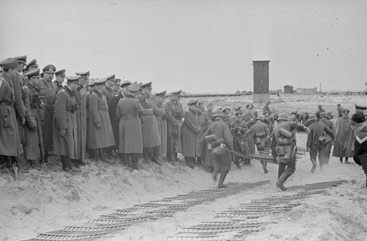 Dans un port, le chargement de camions dont l'un est immatriculé "VH" identifiant la région de Hessen (immatriculation complète WH 79843), peut-être un camion de la Pk.670. Le chargement est effectué devant l'état-major de la 7e armée allemande et son commandant le général Friedrich Dollmann.