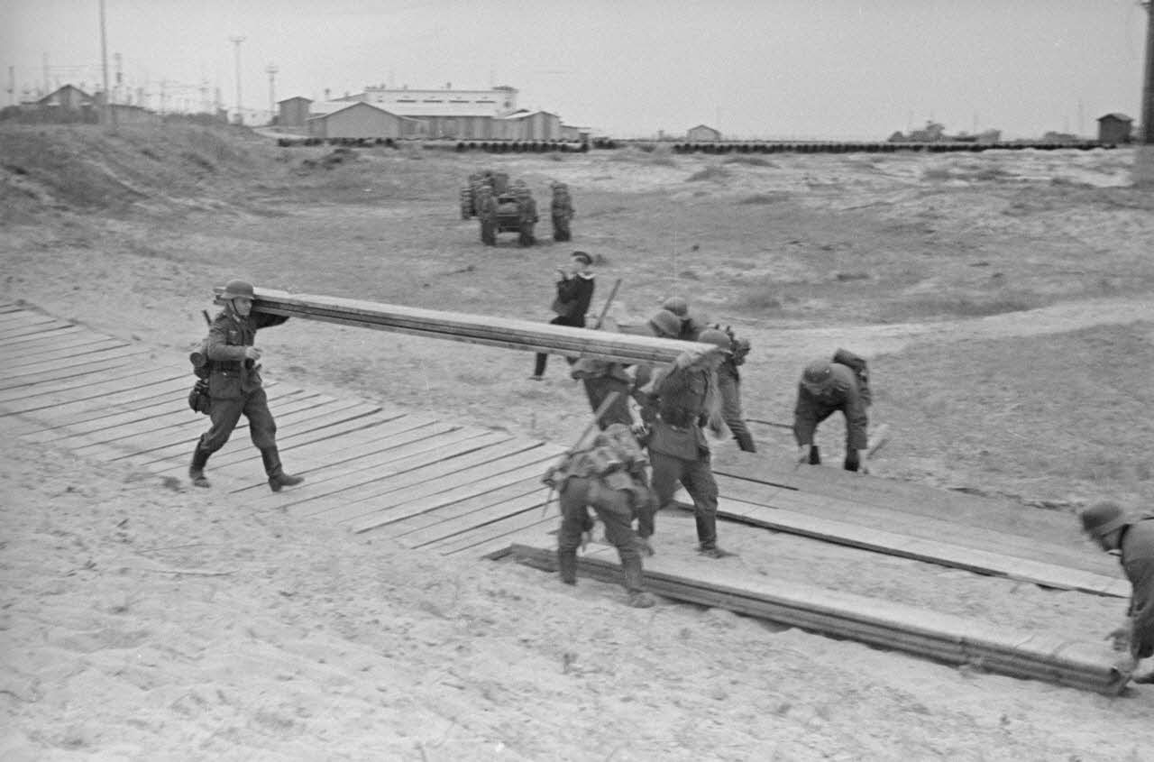 Dans un port, le chargement de camions dont l'un est immatriculé "VH" identifiant la région de Hessen (immatriculation complète WH 79843), peut-être un camion de la Pk.670. Le chargement est effectué devant l'état-major de la 7e armée allemande et son commandant le général Friedrich Dollmann.