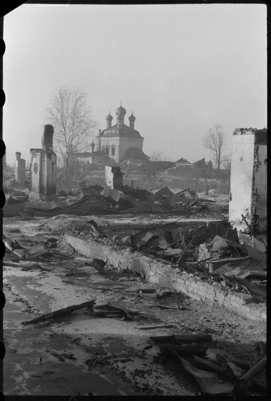 Les ruines de la ville Wjasma (Viazma) encore occupée par l'armée allemande.
