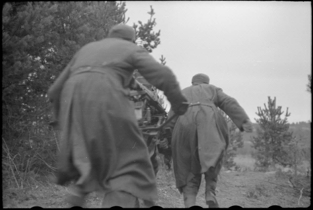 Un officier et un caporal-chef d'un régiment de chasseurs (Jäger) sont décorés de la croix de fer. Le reporter reste aux côtés des fantassins qui, à l'abri de leur tranchée, défendent les lignes allemandes. Sur le parapet de la tranchée, on remarque une mitrailleuse MG-42, ainsi qu'une autre sur un affût lourd.