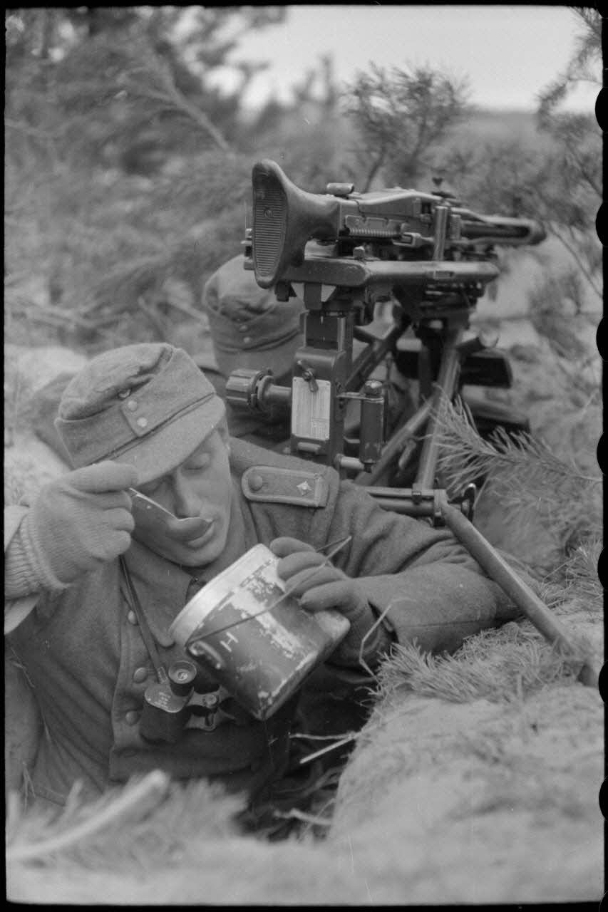 Le servant d'une mitrailleuse MG-42; malgré la cadence de tir de cette mitrailleuse, les étuis sur la tranchée témoignent de l'intensité de la défense allemande.