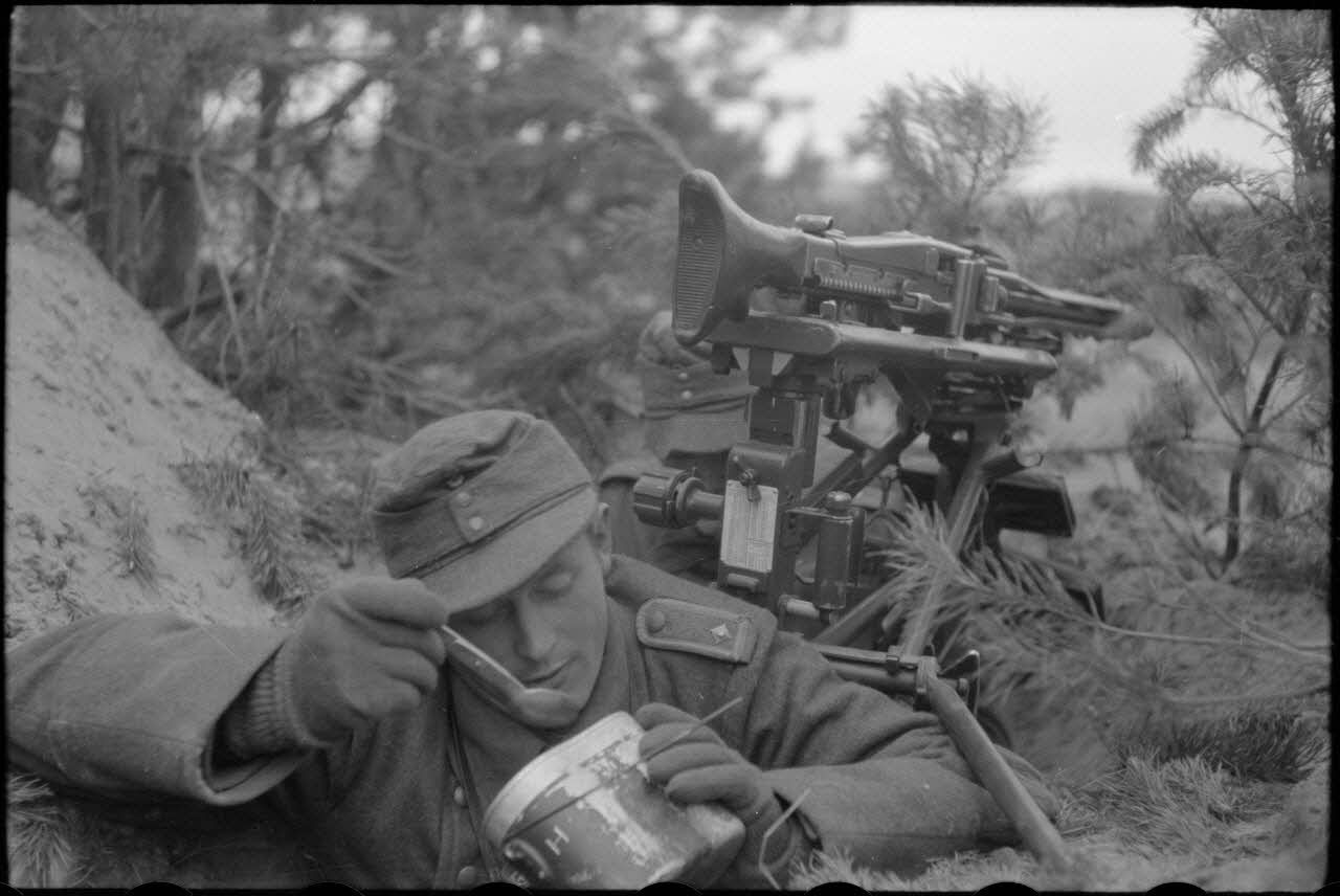 Le servant d'une mitrailleuse MG-42; malgré la cadence de tir de cette mitrailleuse, les étuis sur la tranchée témoignent de l'intensité de la défense allemande.