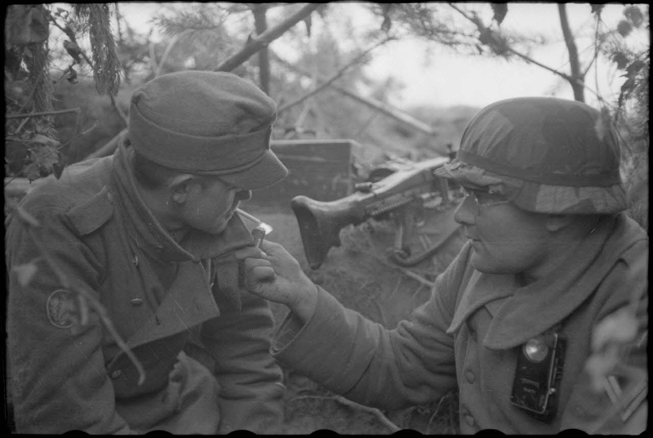 Un officier et un caporal-chef d'un régiment de chasseurs (Jäger) sont décorés de la croix de fer. Le reporter reste aux côtés des fantassins qui, à l'abri de leur tranchée, défendent les lignes allemandes. Sur le parapet de la tranchée, on remarque une mitrailleuse MG-42, ainsi qu'une autre sur un affût lourd.